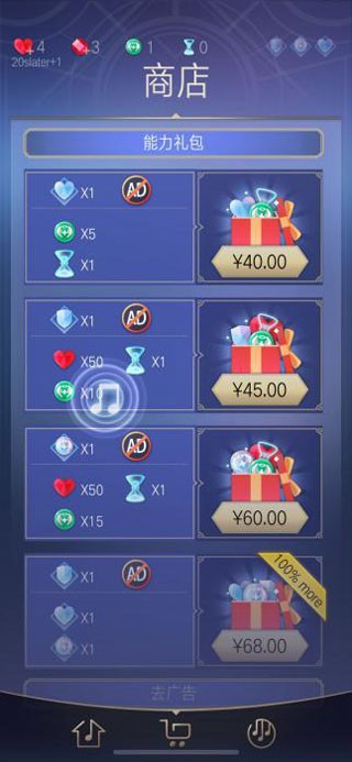 除弹窗广告的项目包含在三个礼包中,单独购买需要花费¥40,相比之下更推荐购买带有去除弹窗广告项目的道具礼包。