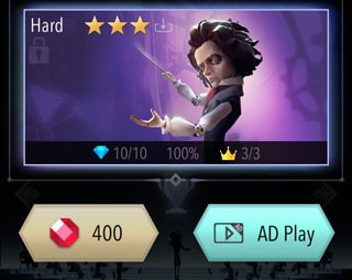 在选择关卡的页面点开音符气泡,页面等一会才会在右上角出现关闭按钮,此举是想让玩家通过看激励广告拿多倍奖励。在取得广告收益的同时,给予玩家红宝石,也让玩家对此广告机制有所了解。