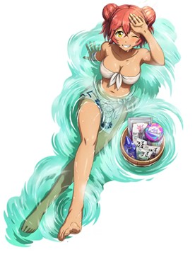 另外,她使用的手巾是用本土可以入手的材料试制而成的,作为图案描绘了像“森林贤王”一样的魔兽。另外,不清楚温泉度假村的更衣室里有没有储物柜,或者只是那种外观的装备品,手腕上好像缠着类似储物柜钥匙带的东西。