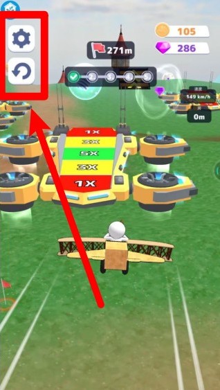 2.左上角的齿轮按钮为设置菜单,圆形箭头按钮可进行游戏重启,随时调整或重新尝试飞行路线。