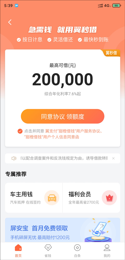 2、点击同意协议,即可领取额度