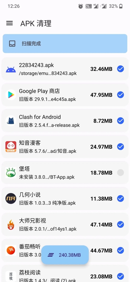 APK清理这个就不用太多介绍了吧 扫描本地的 apk 文件的 当前版本和旧版本会自动勾选 清理的时候请注意你们的绝版 apk 哦