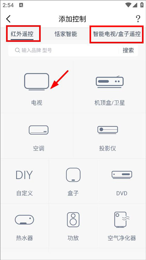 2、进入添加控制页面,用户可选择红外遥控或者智能电视/盒子遥控;