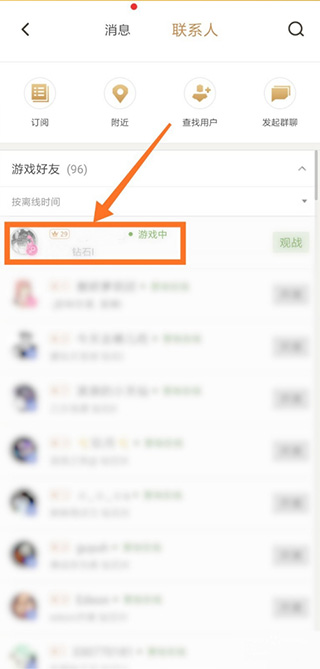4、找到要查看战绩的好友,此处以箭头处好友为例。