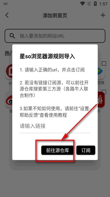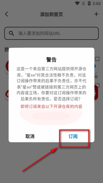 4、请输入正确的URL并点击订阅。如果找不到订阅链接,可以前往开源仓库搜索订阅链接。