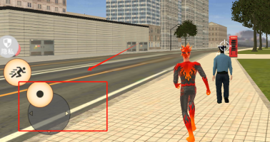 3、操控红衣火焰角色走路,左侧虚拟摇杆移动,右下角箭头加速,留意周围环境别撞树或电话亭。