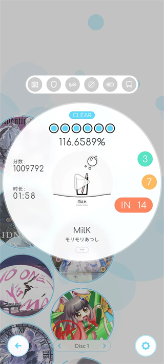 点击圆盘中心的播放便可以开始游玩了。此外要注意,当任意Note获得Miss判定时,屏幕会跳出灰色的长列效果(或者手指点击方位为圆心的扩散圆特效)和x,此时上方的计量条将减少,扣光时将直接退出本局并获得Not Clear评级(未开启Fail保护模式时)。