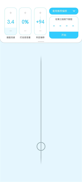 判定偏移是保持游玩质量的重要保障,你可以点击右上角的开始,并在每一小节的第三拍点击,四次点击后可以选择是否应用此次预设,若因各种原因导致漏击和错击,则可以重试。可以通过多次利用上面介绍的判定分布进行调整。
