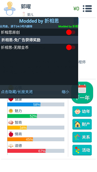 1、一款轻度模拟人生的休闲游戏,从婴儿到死亡的全部过程,你的选择将决定你的未来;