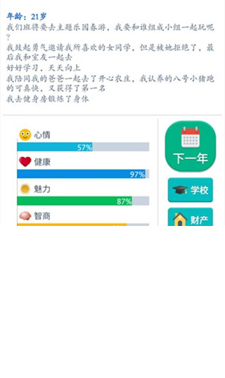这是一款轻松休闲的模拟人生游戏。在游戏中,玩家可以体验各种不同的事件和家庭生活,包括养育子女乃至享受天伦之乐。从婴儿时期开始,你的各项属性会随着经历的不同事件而发生变化。当然,你也有许多选择可以做出,完全取决于你想成为怎样的一个人。