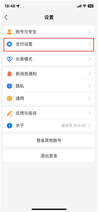 3、接着来到设置的页面中有账号已安全、支付设置、长辈模式、隐私等功能,在这里我们点击【支付设置】;