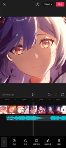 2、导入完成后,即可进入“视频编辑”界面。在这个界面中,我们可以在底部点击“音频”功能,然后在下方列表中选择“音乐”按钮,从而找到自己感兴趣的在线卡点歌曲。