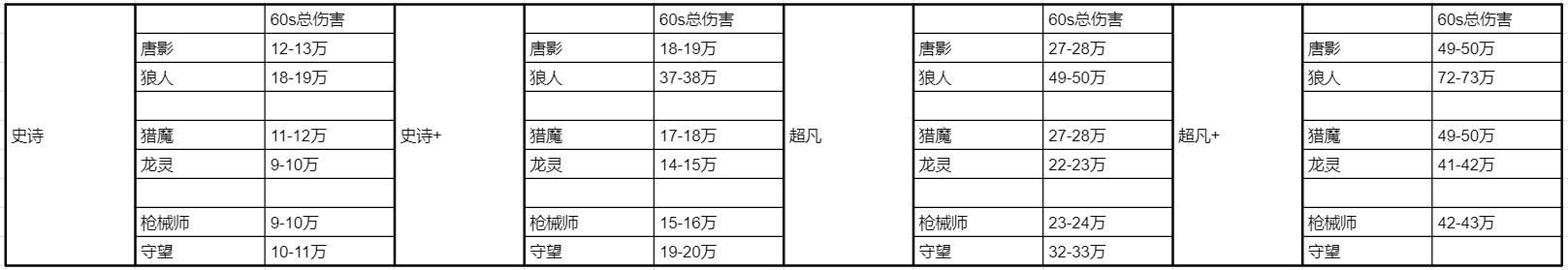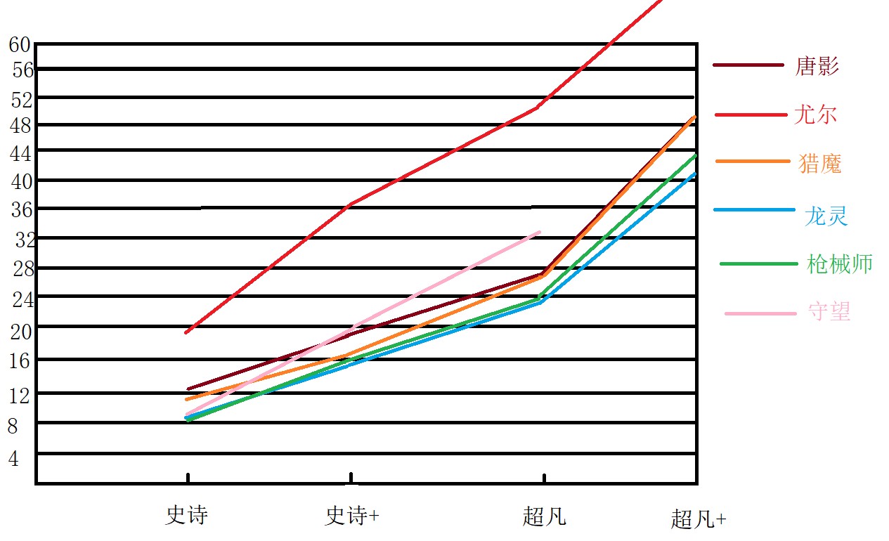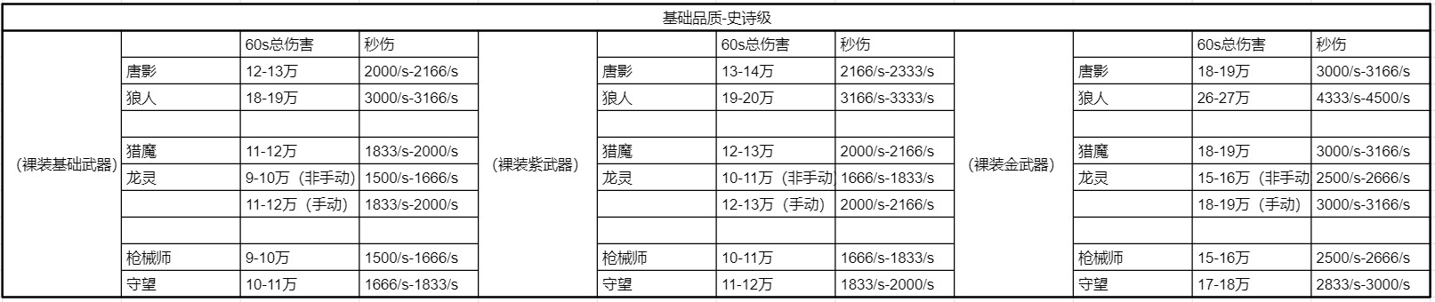 我从猎人最初抽到的史诗级品质,将其进行晋升至史诗+、超凡以及超凡+品质分别进行了伤害的测试,得出了一组数据和对比图。该测试中同样是只改变了猎人的品质,从等级包括使用的武器方面,均没有任何变动,都是基础武器进行的测试。(这里守望我们测试到超凡后,因为碎片实在不够升超凡+,所以这里的数据有所空缺,还望各位见谅)