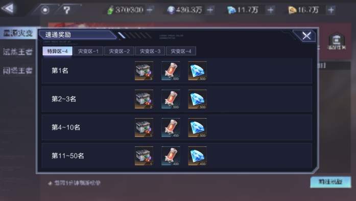 参加星源灾变竞速挑战,根据在不同灾区的竞速表现进行奖励结算,排名越靠前,获得的钻石就越多。不过,这个玩法需要达到55级才能解锁,是后期免费获取钻石的一种方式。此外,为了获得更多钻石,建议尽可能与高手组队哦~
