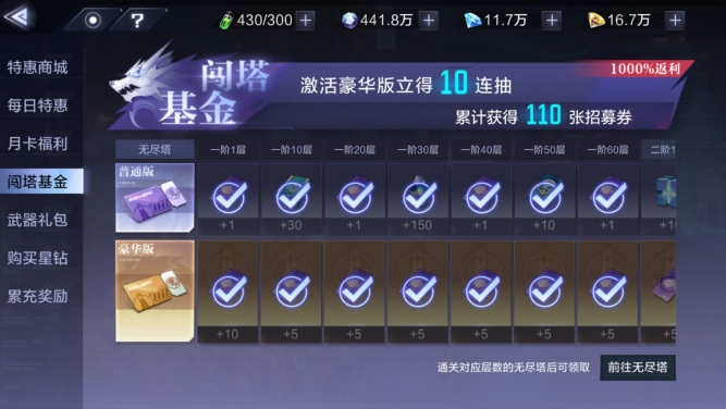 参与无尽塔闯塔玩法,挑战达到一定层数,可以在【闯塔基金】中领取对应的奖励。其中普通版的基金,闯塔至3阶60层,至多可以白嫖获得10张猎人招募券,豪华版基金虽然不属于白嫖范畴了,但是除了基础的10张之外,还可以额外获得100张招募券。