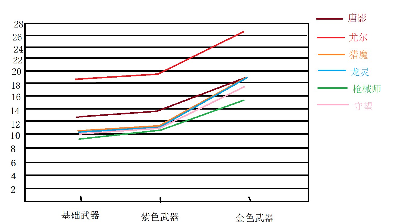 龙灵、猎魔和狼人是受到武器增益后伤害提高比较明显的,枪械师不太吃武器。
