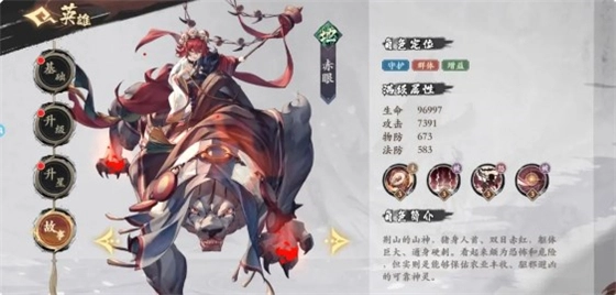 2、盾的话可以使用【地】赤眼/朱厌(在前期可以使用大部分的增益,就是满级熟练之前身板不是很硬,但是女英的治疗可以弥补这一个短板,可以站的更久)。