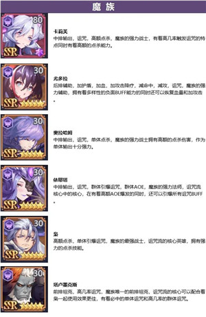 塔卢墨克斯:前排坦克,高几率祖咒,魔族唯一的前排坦克,祖咒流的核心可以配合着另一起使用效果更佳,有看必中的单体祖置和高几率的群体祖咒。