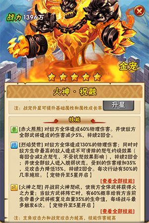 火神·祝融出战属性为全体伤害加成。火神·祝融是攻击宠物,比较适合护佑·主将,更大限度的发挥主将的实力。