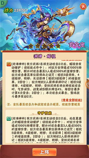 全新玄金战宠渊神·鳐祖的主动技能拥有大量五级增减益清除,发动后可迅速扩大对敌优势。同时,该技能还拥有伤害追加效果,可以将上次的伤害优势代入下回合输出,实现伤害的滚雪球效应。主动技能拥有的巨额减伤+受击回血的特性,搭配护盾中的巨额最终防御加成,可以有效保证我方单位的存活力。