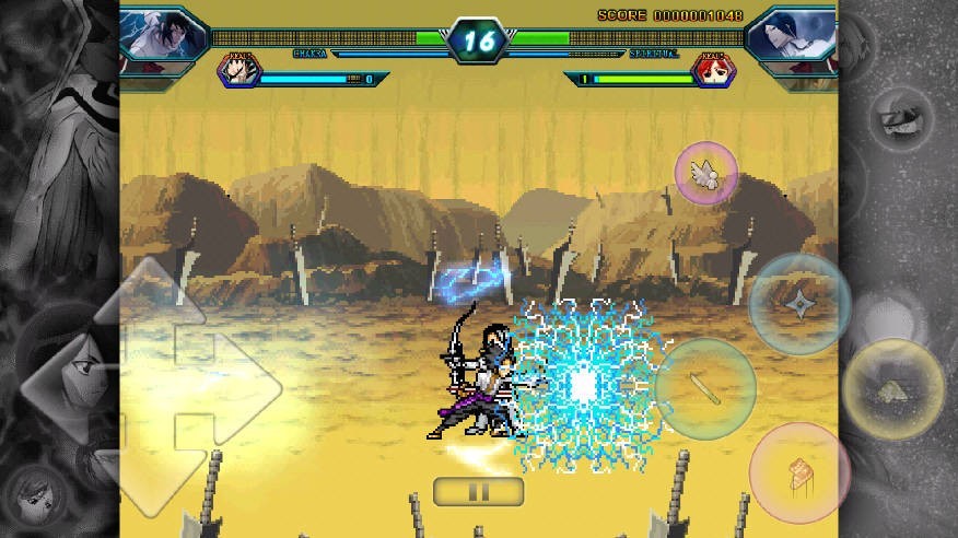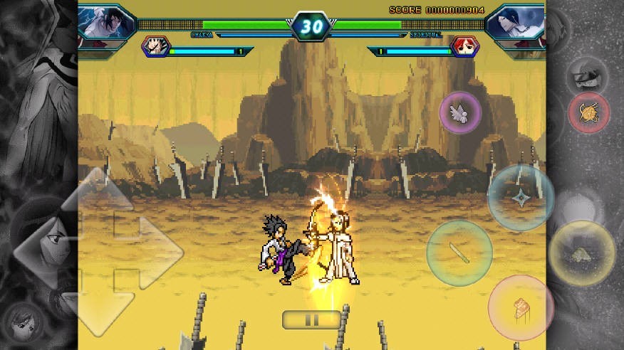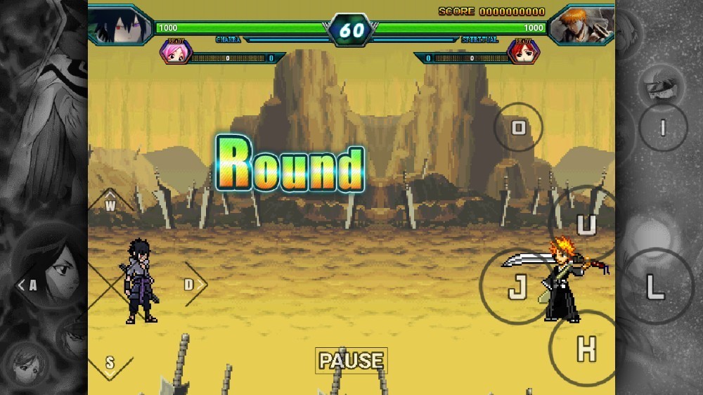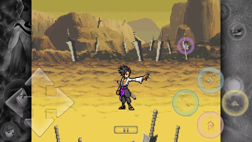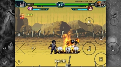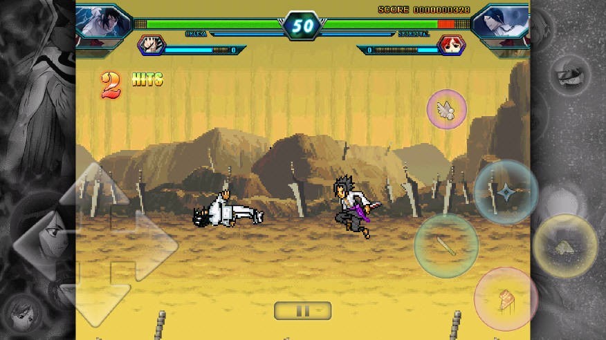 4、进入游戏后,左侧控制角色的移动,右侧负责攻击。你还可以点击下方中间的【pause】按钮来暂停游戏。在战斗过程中,请留意上方的绿色血条;如果绿色血条快要耗尽,记得要及时躲避对手的攻击。