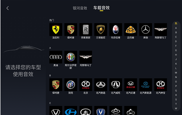 2、进入音效设页面,选择你的车型,可以根据你的车型使用音效