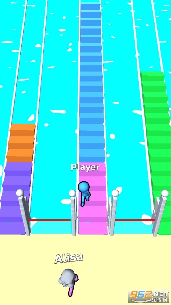 许多玩家共同参与竞速挑战,收集木板建造桥梁以抄近路前进。