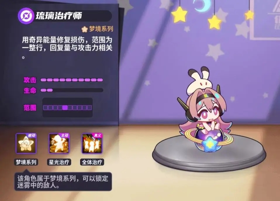 技能:星光治疗:使攻击范围内的一名受伤角色恢复生命值
