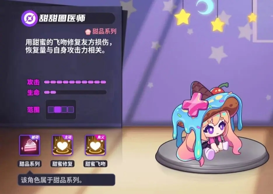 技能:甜蜜修复:同时为攻击范围内两名受伤的角色恢复生命值
