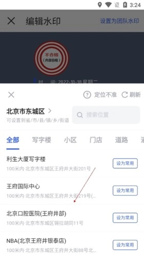 4、进入相机页面后,点击“水印”,挑选所需的水印。最后,点击拍照页面的定位标志,输入自己想要填写的地址。