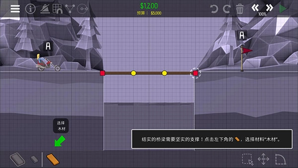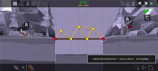 4、玩家需要在限制的成本内使用各种材料建造桥梁,点击右上角就可进行测试。