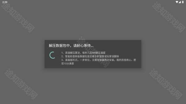 1、本版本是模拟器版本,我们安装完游戏后打开,第一次需要解压数据包,请耐心等待。