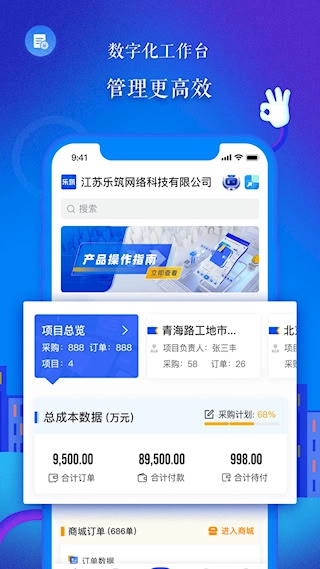 4、业务功能模块分区:商城订单管理与财务数据查询独立呈现,支持建筑项目全周期流程监控。