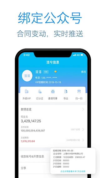 1、负责应收合同与应收账款的全周期管理,涵盖记录相关信息,同时支持创建电子账本,能够自动跟踪每一笔款项的到期时间以及还款进度。