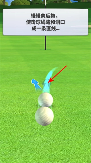 4、对击球线路进行调整,缓缓向后拖动,让击球线路与洞口处于同一条直线上,以此提高把球打进洞的成功率。