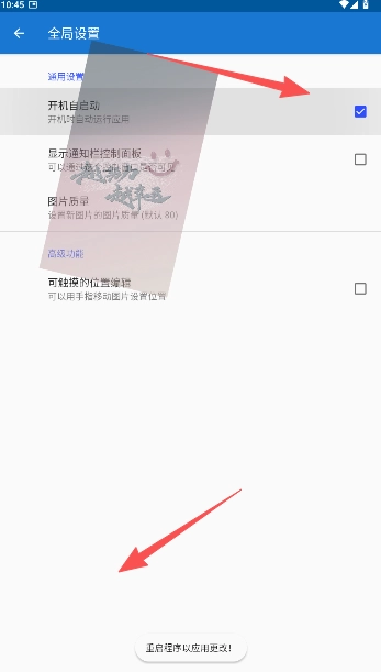 2、在全局设置的页面详情中,对应用的开机自启动进行设置,勾选即为设置成功,重启后生效。