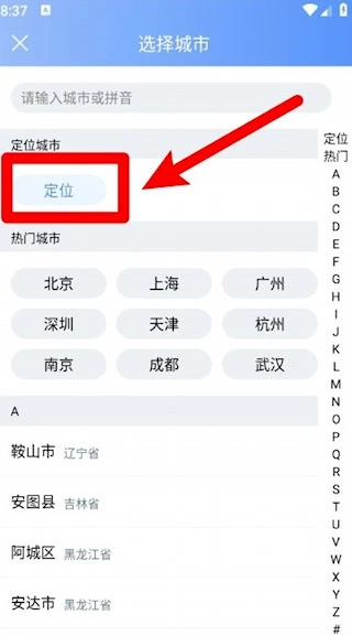 1、启动应用进入主界面,点击顶部定位标识进入城市管理页面。
