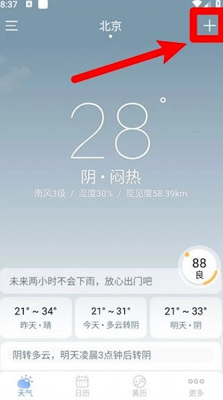2、选择当前城市名称旁的添加符号,即可进入城市列表进行切换。