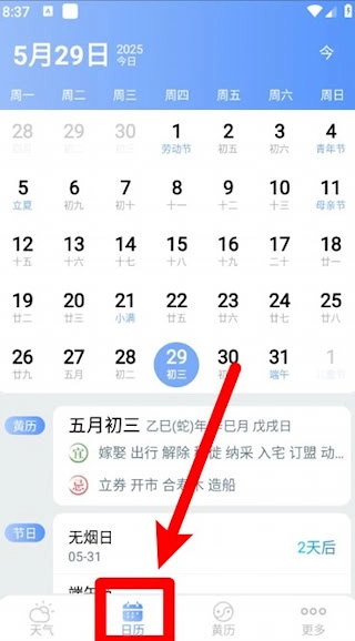 3、从底部功能栏点选日历入口,浏览包含节假日的详细日期信息。