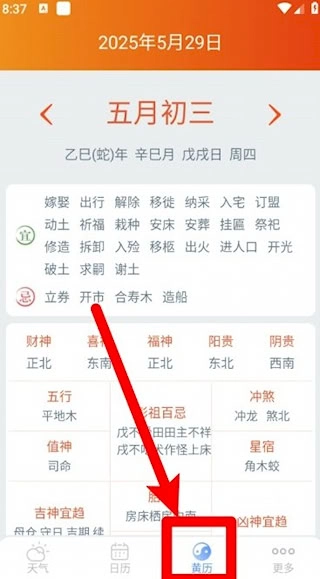 4、通过底部黄历图标进入当日详情页,查看传统历法相关生活指引。