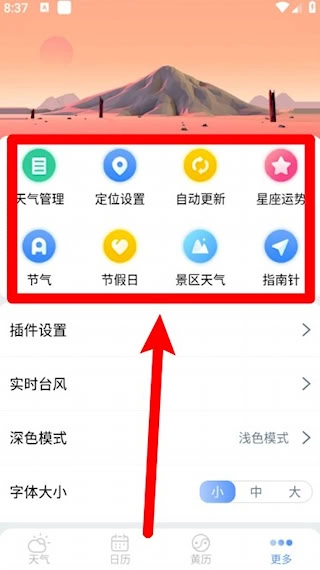 9、个性化设置项:支持主题更换、字体调节、自动更新、景区天气查询等扩展功能。