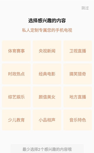 用户在本站并打开软件之后就会跳转到爱好选择页面,可以选择自己喜欢观看的内容,也可以点击右上角跳过。