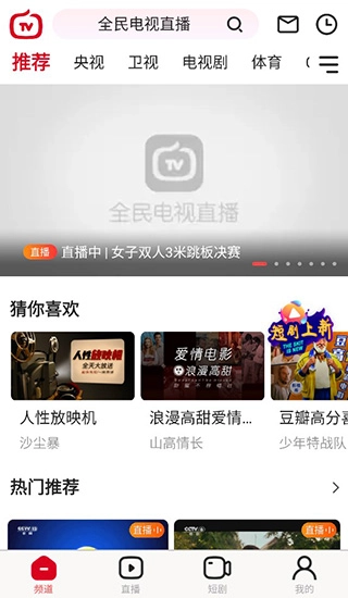 用户进入频道页面就可以开始看电视直播啦,可以在屏幕上方的分类里选择推荐、央视、卫视、电视剧等视频分类进行观看。