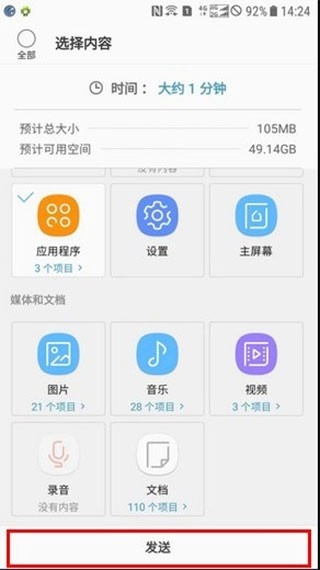 12、在旧设备上挑选要传输的内容,勾选想传输的文件,然后点击【发送】。