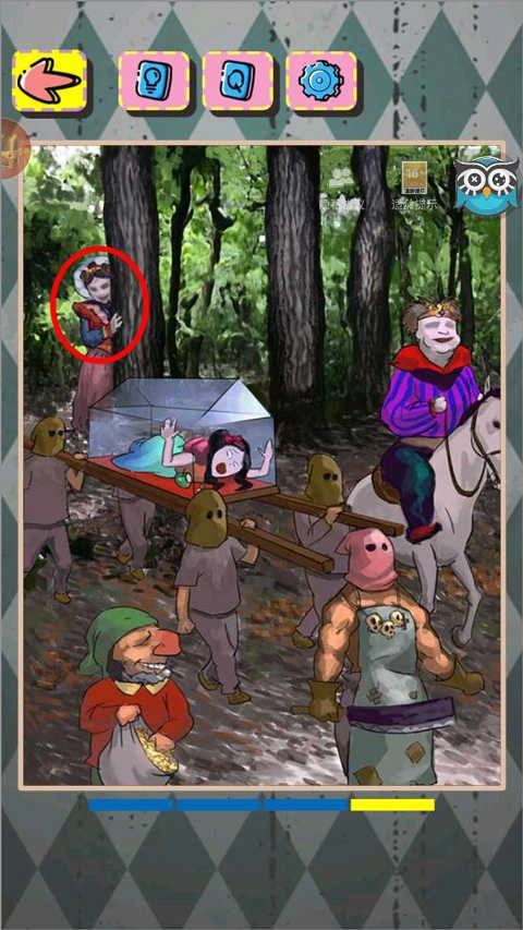 1、当玩家进入游戏后,务必要认真研读题目,从中找出戴王冠的王子,他就是绑架白雪公主事件的负责人。