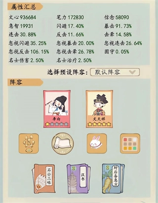当选择“暴击流”进行挑战时,可预先设定以下阵容展开挑战。名士方面,推荐携带李白与文天祥。在道具携带上,优先选择传家宝盒[高级·玉清匣]以及宠物小兔子,以此提升忽视反击属性。此外,还可携带万卷书 - 兵法[石公三略],来增强暴击属性。