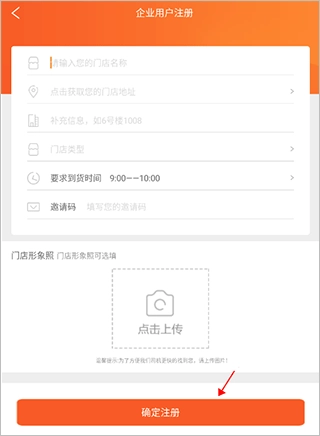 3、进到企业用户注册界面后,输入店铺名称、地址等信息后,点击注册后就等待通知啦!