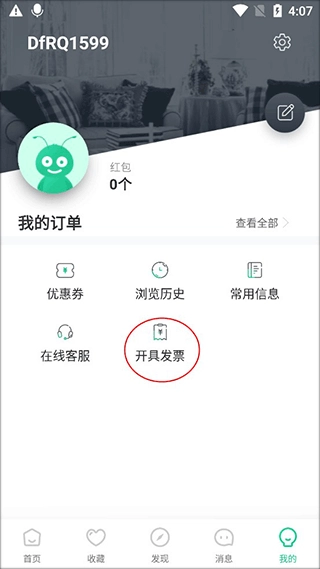 我们来到【我的】个人界面,在此界面中点击开具发票。