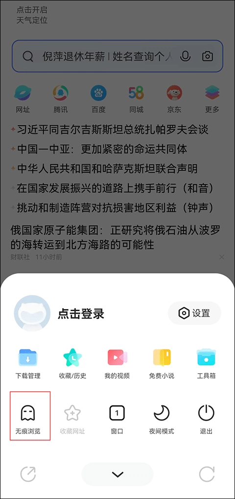 2、弹出的功能栏点击打开【无痕浏览】按钮;