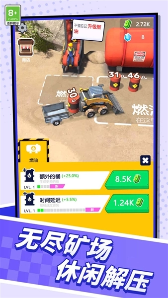 2、售卖所得的资金,能够用于升级挖掘机。通过积极挖掘,可获取更多财富。不过要留意,车子要是没燃油了可就无法运作。